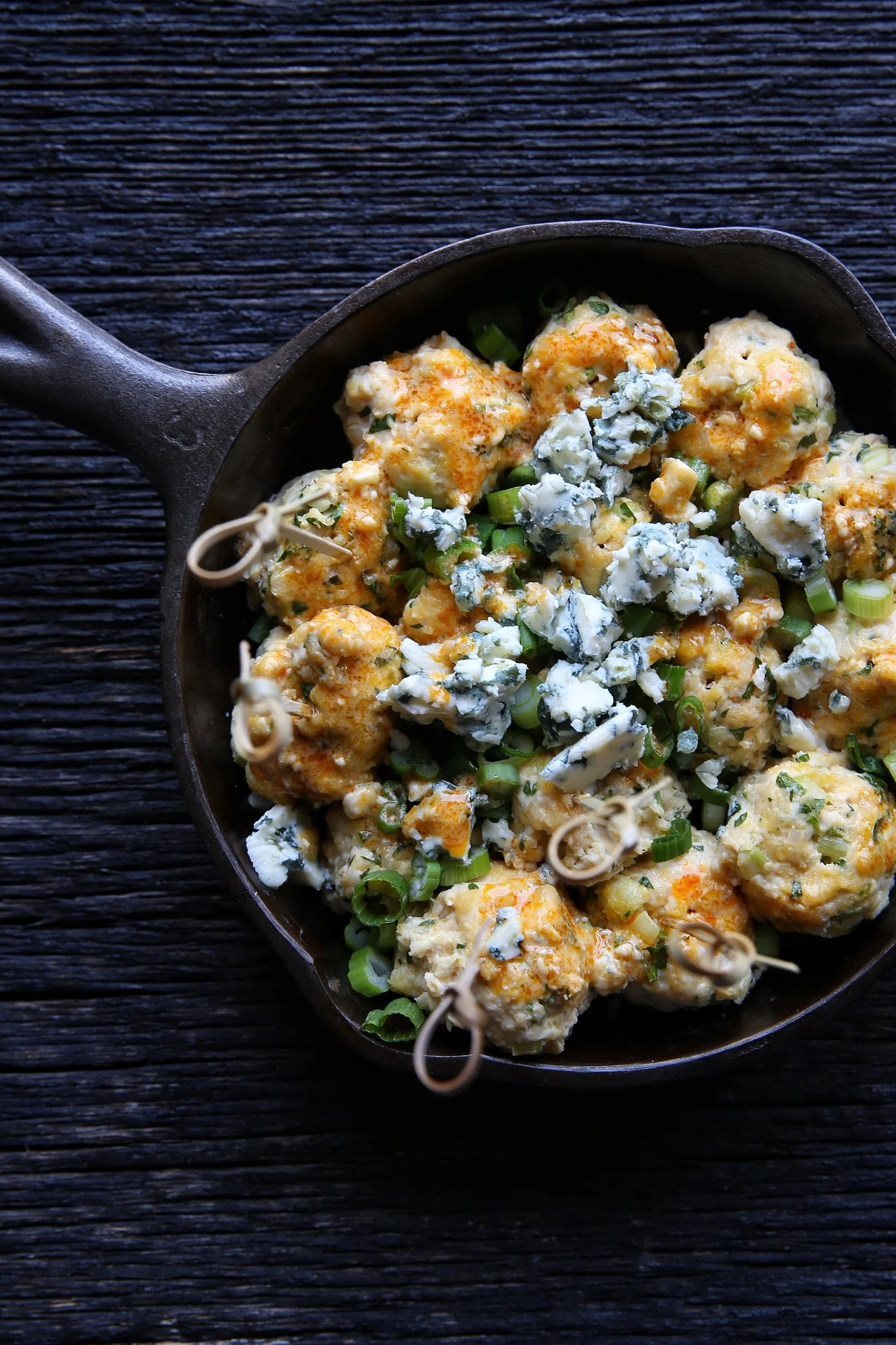 Pour the reserve hot sauce mixture over the meatballs as soon as it comes out of the oven. Top with the remaining crumbled blue cheese and scallions.