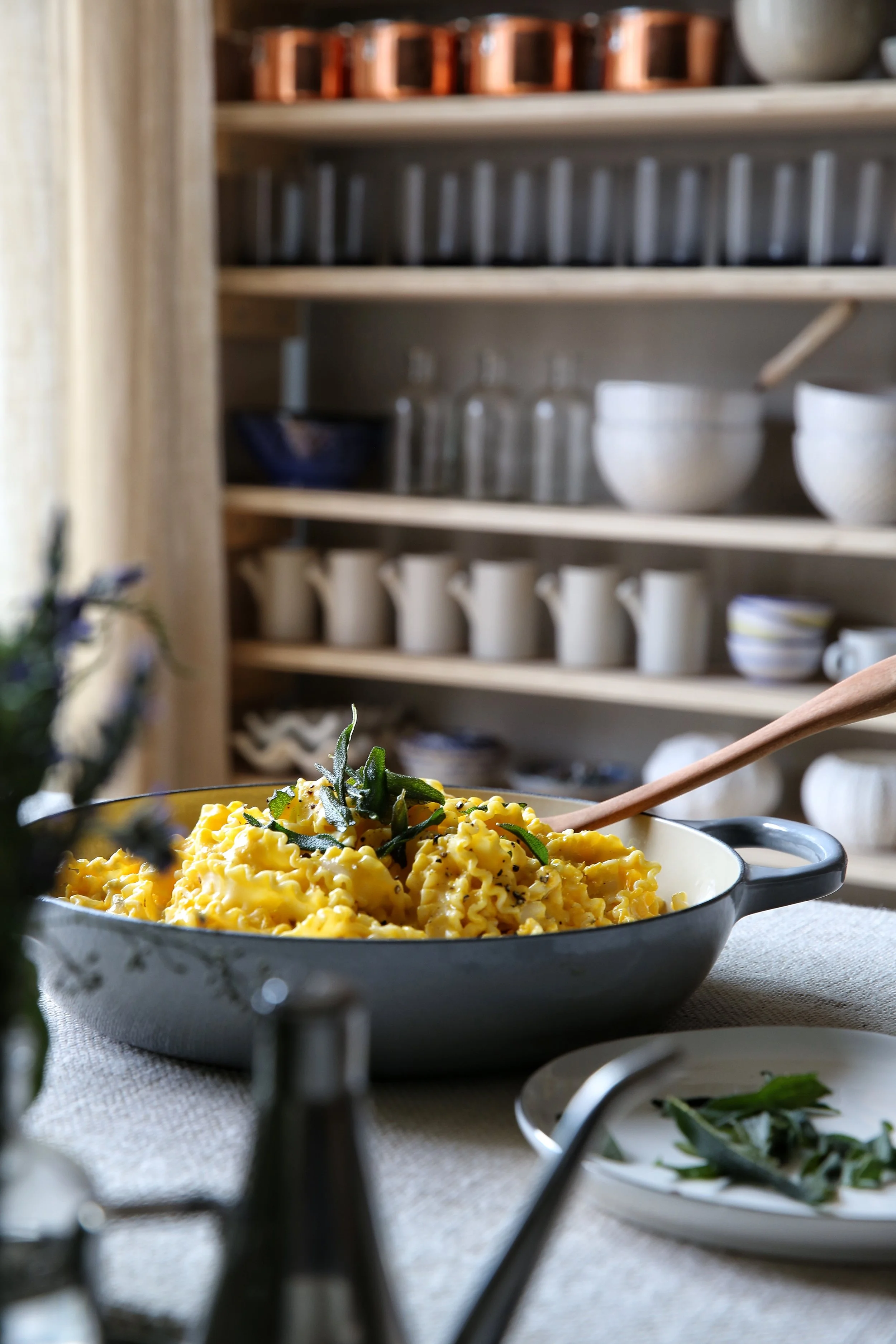 Fall is my favorite season. The cool crisp weather creates a desire for comfort food and often the flavor of pumpkin. The base of the sauce is roasted pumpkin, white wine, garlic and onions. There is sour cream for a little tang. Cold butter finishes the sauce. It melts slowly and creates an extra level of creaminess. Fried sage gives it a subtle crunch and a punch of flavor.