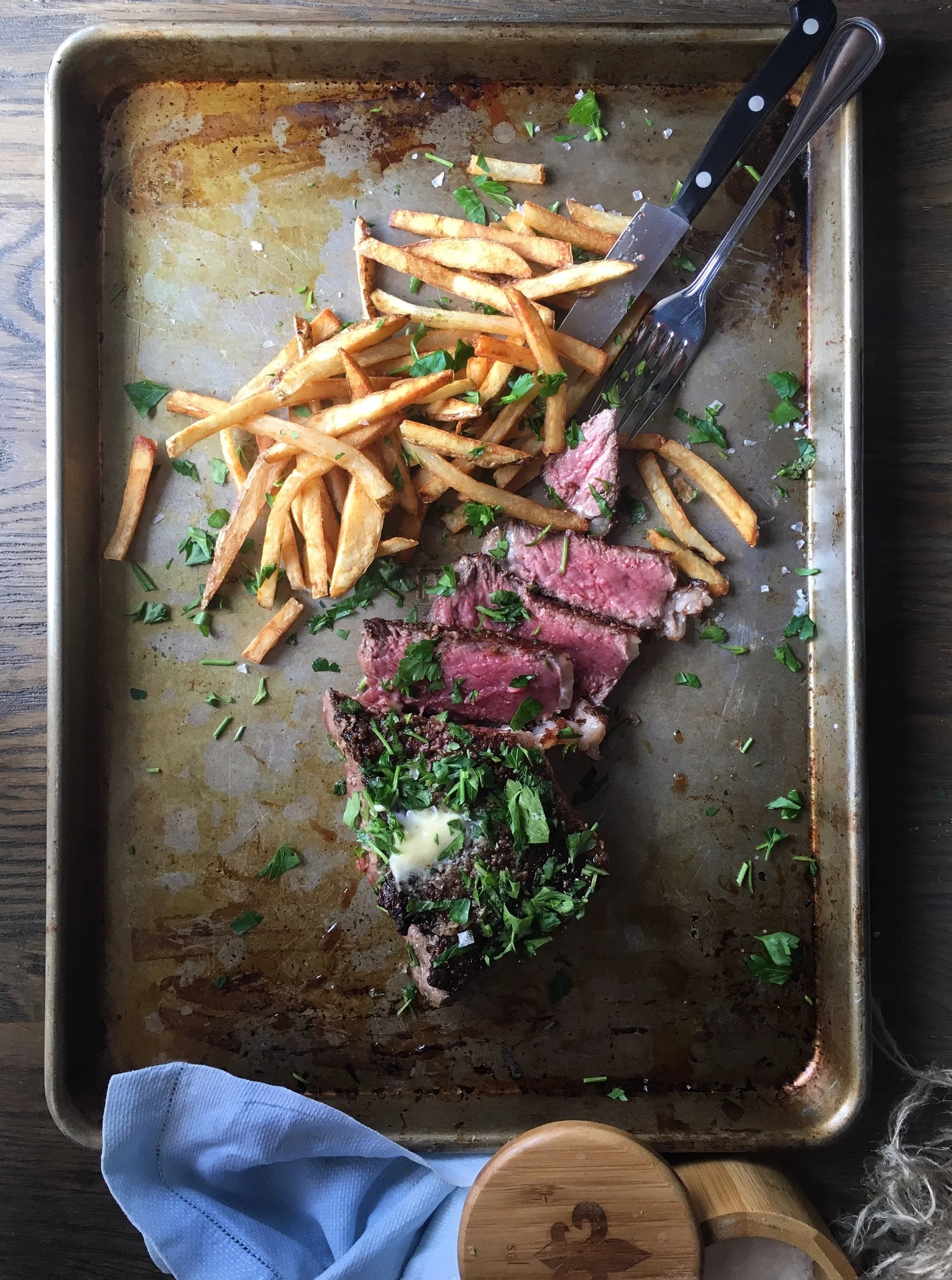 Serve steak frites with sprinkle of sea salt and garnish with fresh parsley.